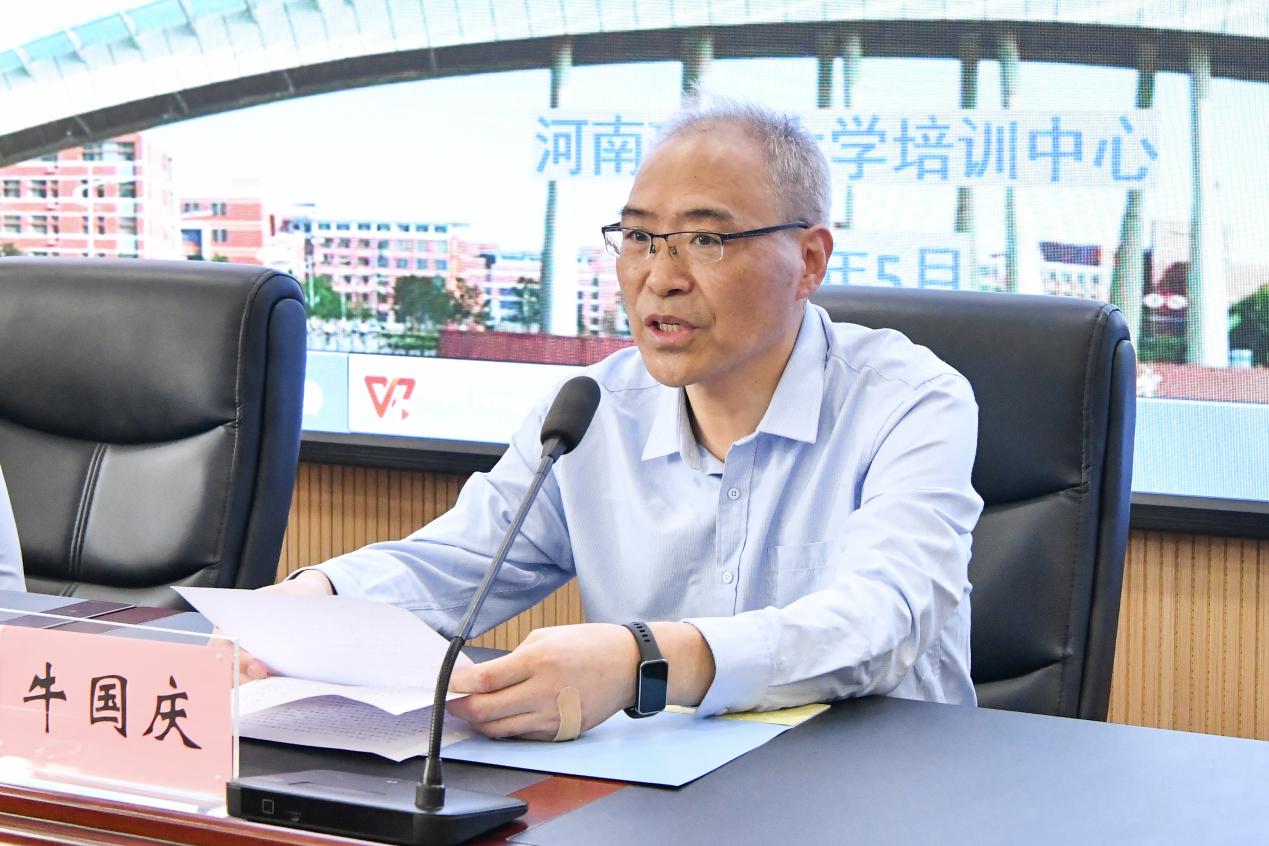 牛国庆致辞,他对学校及培训中心的情况作了简要介绍;他强调自贸区建设是新时代改革开放的重要抓手,本次研修班既是一次理论提升的契机,更是一场实践探索的盛会。作为培训的承办单位,培训中心将全面落实中国(河南)自由贸易试验区郑州片区的各项指示要求,选优配强师资队伍,提供全流程精细化服务保障,全力打造高质量学习交流平台。
