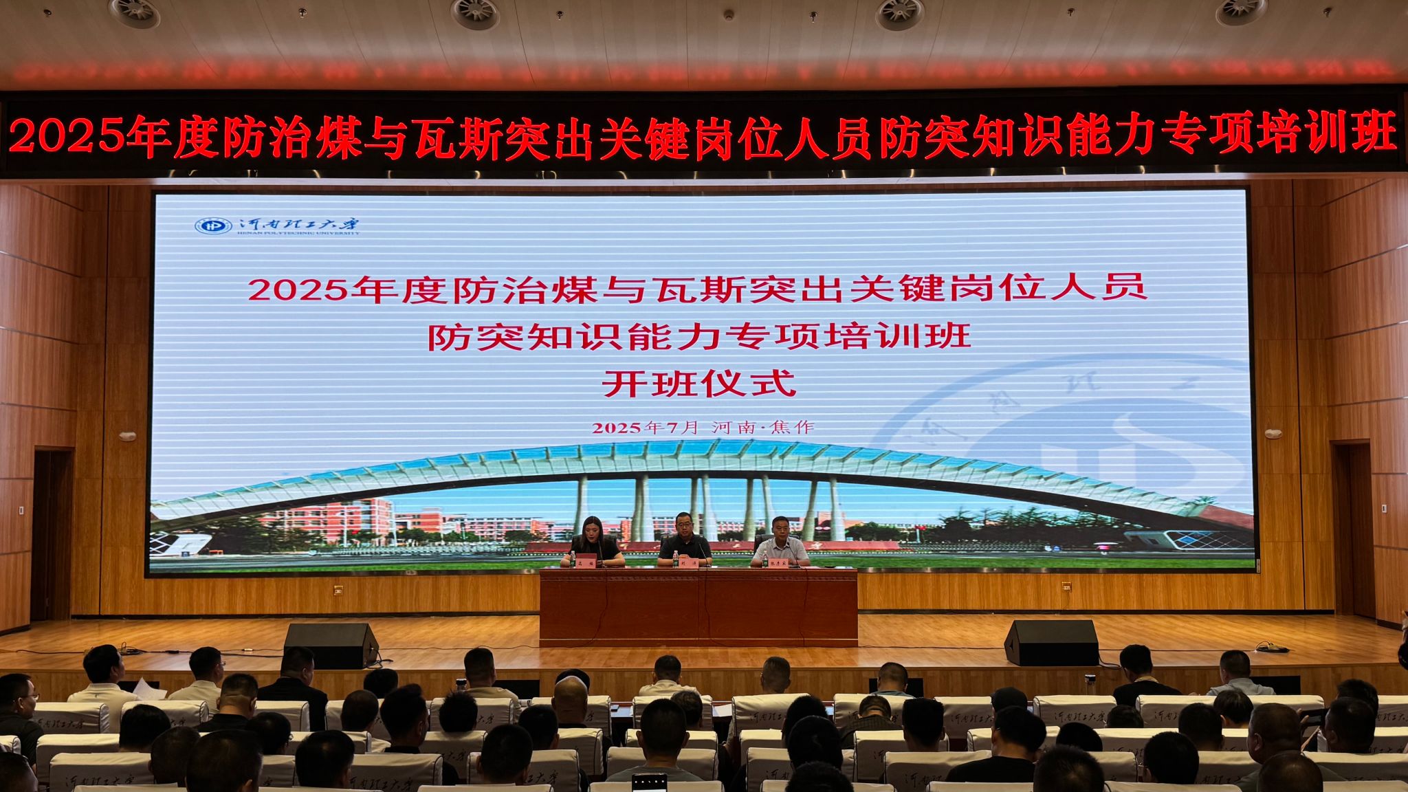 7月22日-8月18日,由国家矿山安全监察局山西局安全培训中心主办,河南理工大学承办的2025年度防治煤与瓦斯突出关键岗位人员防突知识能力四期专项培训班在我校举办,参训学员400余人。培训班邀请了来自中国安全生产科学研究院、淮北矿业集团、淮南平安国家煤矿瓦斯治理工程中心、河南能源集团焦作煤业公司瓦斯研究所、中煤科工集团重庆研究院瓦斯研究分院、河南理工大学等校内外知名专家开展授课。