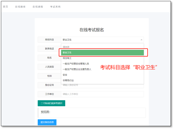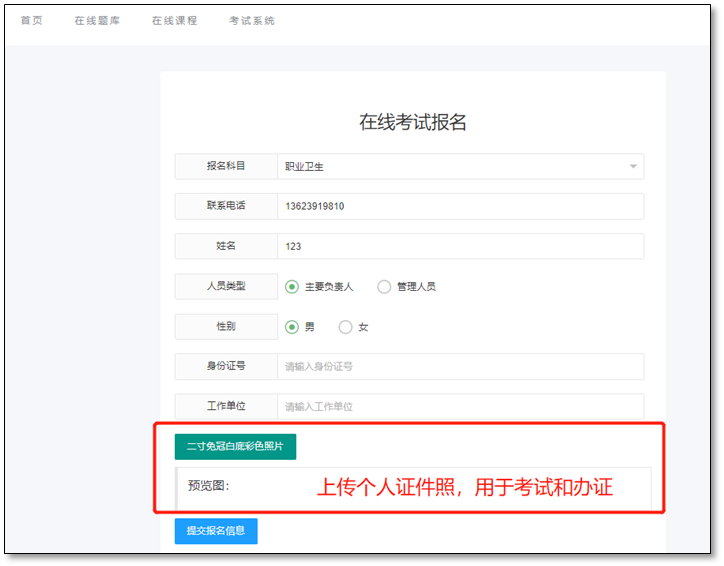 考试科目(“职业卫生”)、联系电话(接收准考证号)、姓名、人员类型(根据人员类型选择主要负责人或者管理人员)、性别、身份证号、工作单位及照片均需真实填写和上传,以免影响考试和发证。