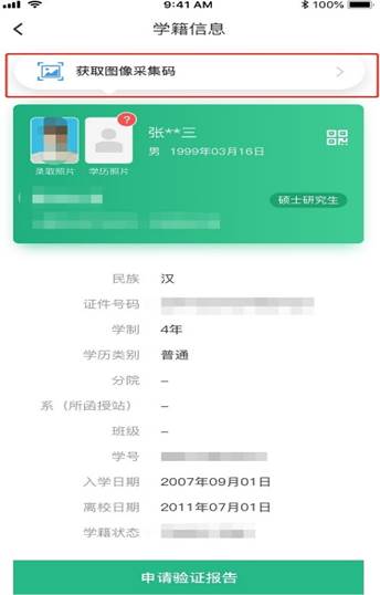 获取图像采集码有三种途径:①学信网;②学信网微信公众号;③学信网APP. 通过上述三种方式获得图像采集码,并保存到手机上。