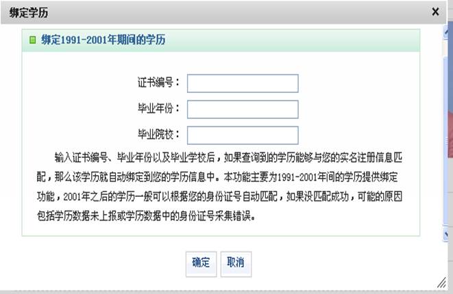 2001年之后的学历一般可以根据您的身份证号自动匹配,1991-2001年间的学历可能需要点击“[我还有学历没显示出来]”进行手工绑定。如果你的学历数据未上报注册或学历数据中的身份证号采集错误等,则无法进行绑定。